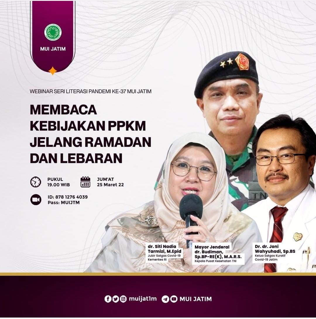 MUI JATIM – Mejelis Ulama Indonesia (MUI) Jatim melalui Badan Kesehatan membahas terkait ‘Membaca Kebijakan PPKM Jelang Ramadan dan Lebaran’ pada webinar seri literasi pandemi ke-37 Jum’at (25/03/2022).