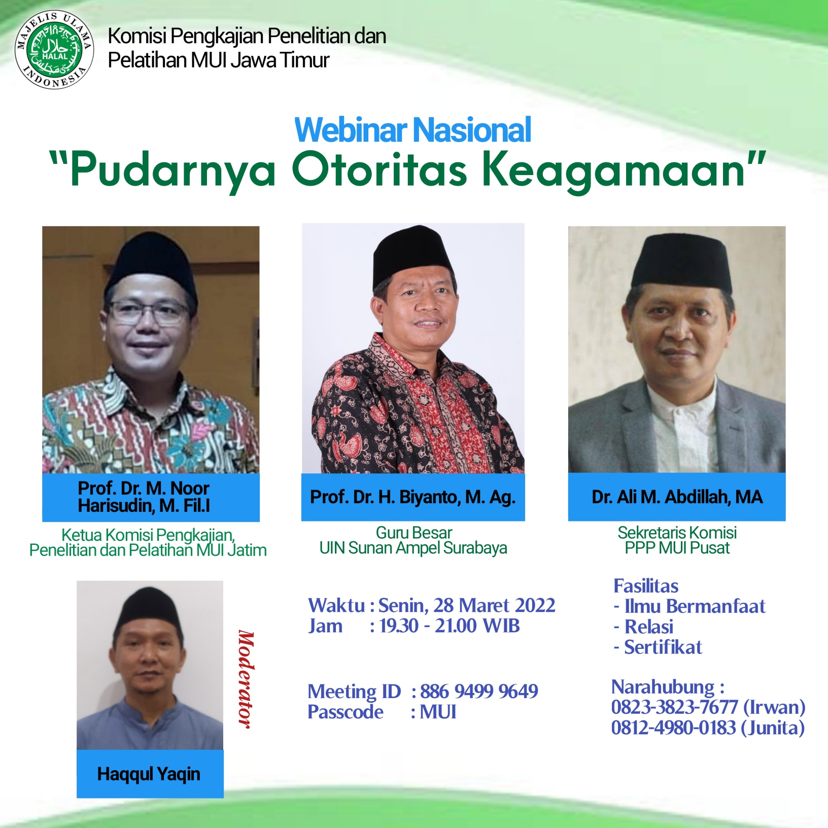 Media Center – Di era globalisasi seperti sekarang ini, perkembangan teknologi khususnya teknologi informasi telah berkembang dengan pesat. Hal ini tentu berakibat pada perkembangan Islam di berbagai belahan dunia yang sedang mengalami tantangan yang cukup serius dengan dampak dari revolusi digital. Merespon hal tersebut, Komisi Pengkajian Penelitian dan Pelatihan MUI Jawa Timur telah menyelenggarakan Webinar Nasional bertajuk, “Pudarnya Otoritas Keagamaan” pada Senin, (28/3) pukul 19.30-21.00 WIB secara online melalui aplikasi Zoom Meeting.