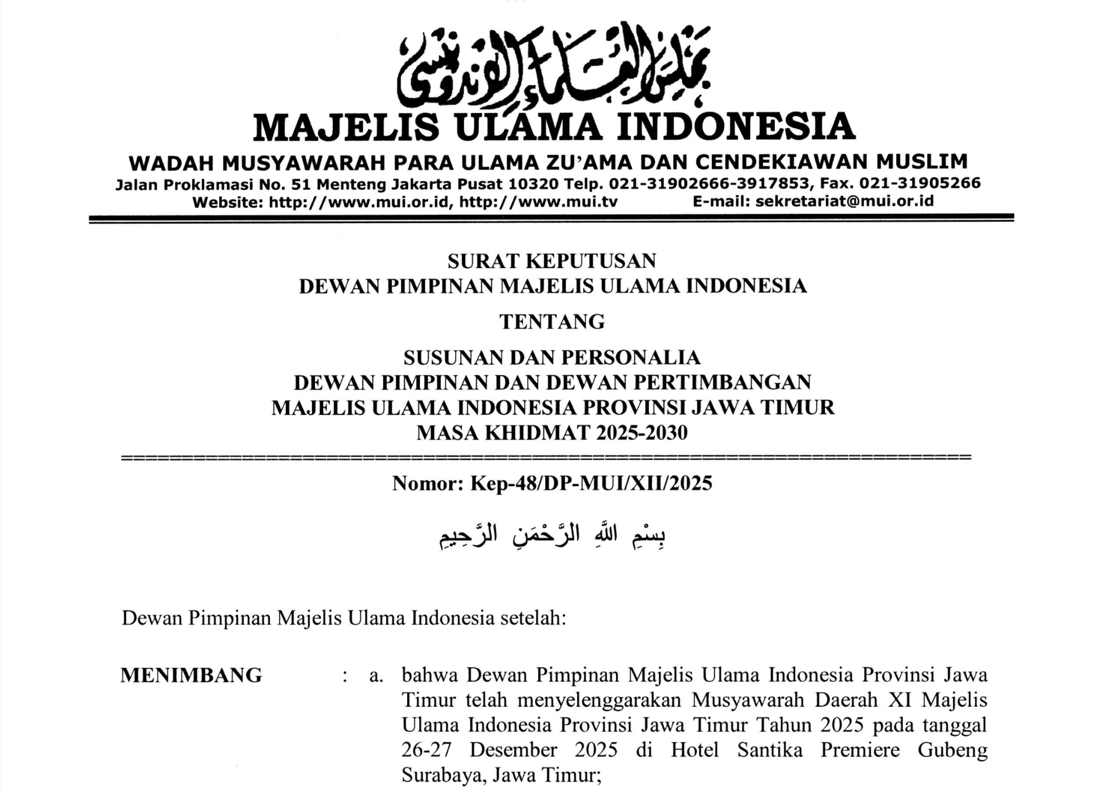 SK MUI Provinsi Jawa Timur Masa Khidmat 2025-2030